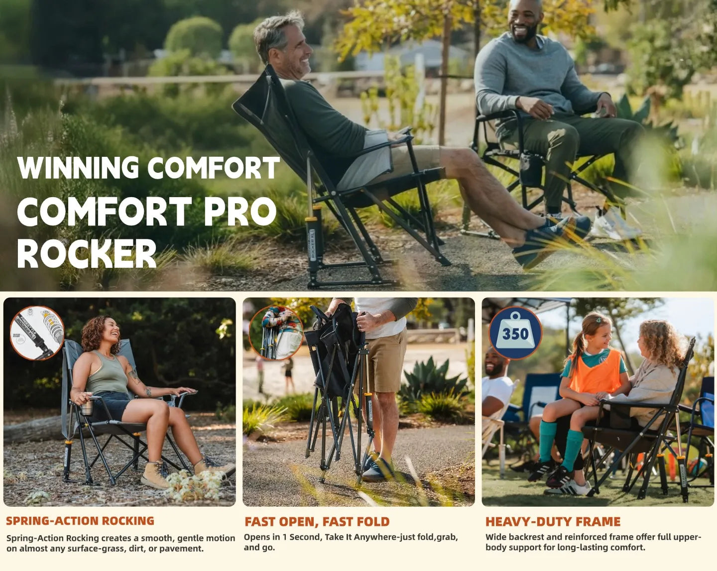 Patented Spring Comfort for Any Outdoor Spot — Enjoy smooth rocking at campsites, beaches, tailgates, and game days.